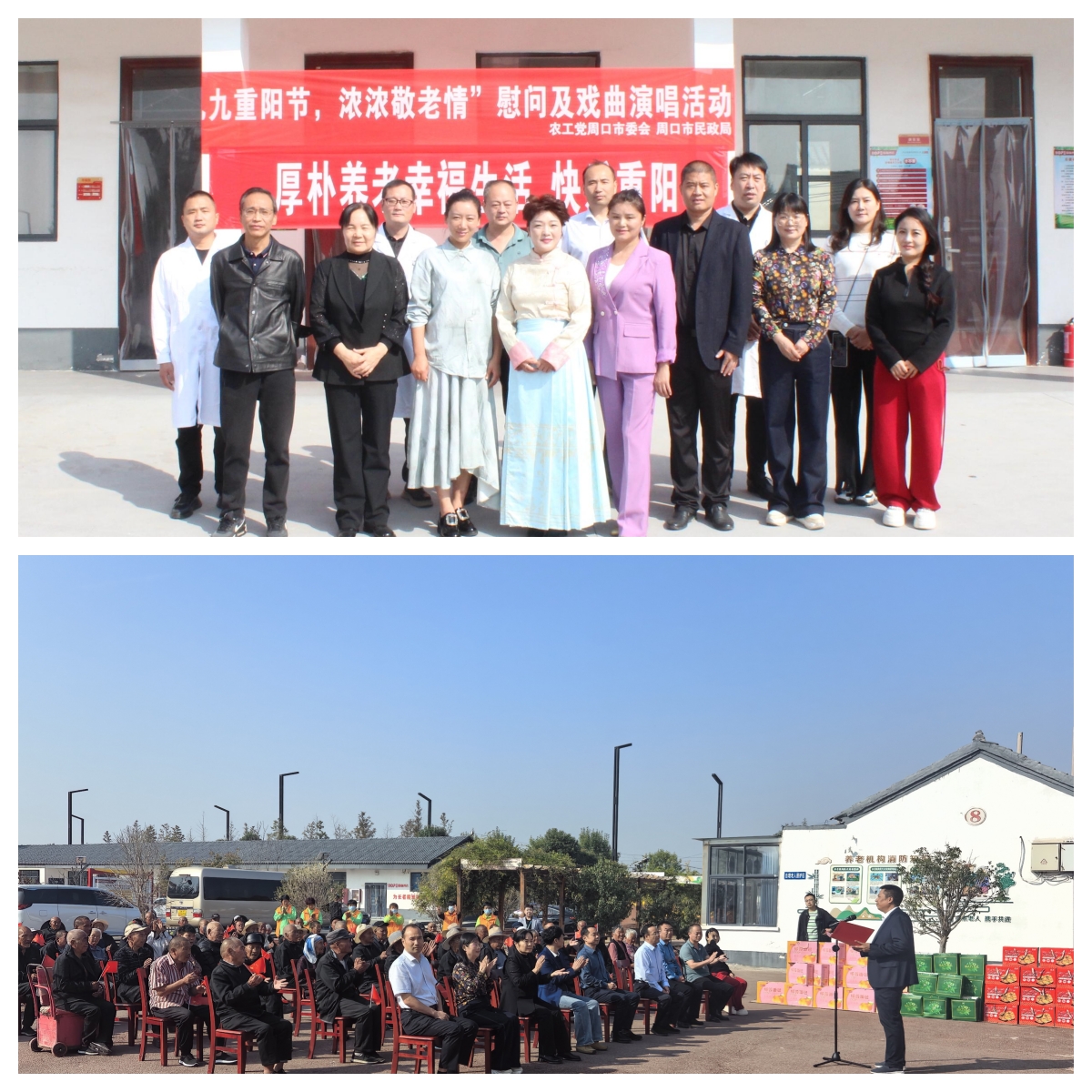 金秋送爽、丹桂飘香,又是一年重阳时,为弘扬中华民族“尊老、敬老、爱老、助老”的优良传统,10月11日,农工党周口市委会联合周口市民政局到淮阳区王店街道敬老院开展“九九重阳节,浓浓敬老情”慰问演出及义诊咨询活动。周口市政协副主席、农工党周口市委会主委、周口市民政局局长程若光,中共淮阳区委书记张建党出席活动,市委会专职副主委洪玉显,农工党周口市第五支部主委麻冬梅,副主委刘乾坤、张娜,党员郭明雷、王险峰、宋玉,第六支部主委刘震,副主委李伟,党员李基甸、魏士翔、张振东参加活动。